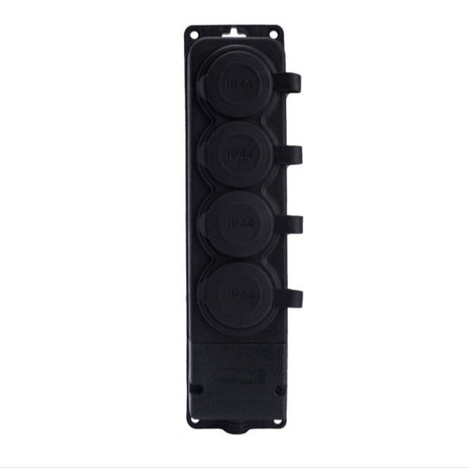 The stand-alone rubber socket can be used as a self-installed socket on a wall or any other surface, it has 4 sockets (2P+E) with a rubber cover against water, splash and dust. The cable connector is concealed under the unscrewable cover. A built-in rubber cable grommet is used for cable routing. Maximum cable cross section 3*2.5m It has a hole for easy hanging and 4 screw holes used for fixed mounting on the workstation.