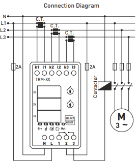 190A – 300A (adjustable overload value) 50% fixed current asymmetry Adjustable error delay time Adjustable operating mode (automatic, semi-automatic, manual) Current measuring transformers included Technical specifications: -20°C to +55°C Display: 3×3-digit display + 5 LEDs High current (overload): TRM-50: 15A – 50A TRM-100: 40A – 100A TRM-200: 90A – 200A TRM-300: 190A – 300A TRM-400: 290A – 400A Delay (t): TRM-50/100: 0.1 s – 20 s TRM-200/300/400: 1 s – 200 s Connection type: clamp Contact: 5A/250VAC (resistive load) Cable diameter: 2.5 mm² Weight: max. 250 g Mounting.