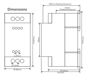 Main parameters: overload adjustment range: 0.5A – 30A Fixed current asymmetry: 50% Adjustable error delay time Built-in current measuring transformers Overvoltage protection: 400V (fixed) Undervoltage protection: 265V (fixed) Fixed voltage asymmetry: 30% Phase sequence control Technical specifications: Operating voltage (Un): 3x380V AC 50/60 Hz Operating frequency: 50/60 Hz Power: <10VA Operating temperature: -20°C to +55°C Display: 3×3-digit display, 7x LEDs High current (overload): 0.5A – 30A Upper voltage limit: 440V (L-L) – fixed Lower voltage limit: 265V (L-L) – fixed Error delay (t): 0 – 20 s Current asymmetry: 50% (fixed), 3 s delay Voltage asymmetry: 30% (fixed), 3 s delay Connection type. 380 g Mounting.