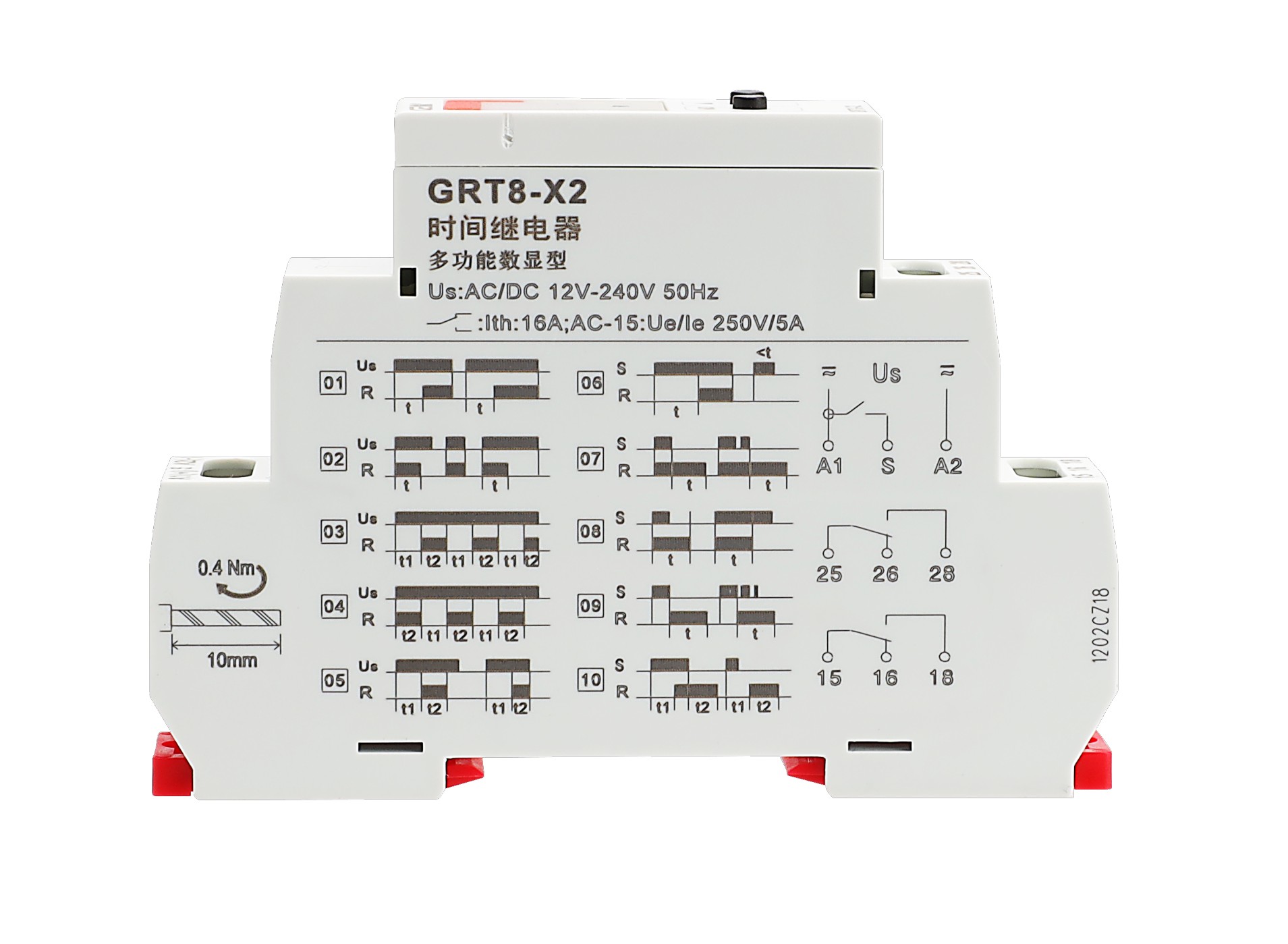 GRT8-X Multifunktions-Zeitrelais mit Digitalanzeige, 16 A, mit 20 Funktionsoptionen, AC DC 12-240V -Multifunktions-Zeitrelais kann für Industrieanlagen, Beleuchtungssteuerung, Heizungssteuerung, Motorsteuerung, Lüftersteuerung verwendet werden -Mit 20 Verzögerungsmodi deckt es einen Verzögerungsbereich von 0,1 Sekunden bis 99 Tagen ab. - GRT8-X Multifunktions-Zeitrelais mit Digitalanzeige - Spannungsbereich: AC230V oder AC/DC12-240V - Ausgang: 16A 2SPDT - 20 Verzögerungsmodi: - 5 stromversorgungsgesteuerte Verzögerungsmodi - 13 signalgesteuerte Verzögerungsmodi - EIN-, AUS-Modus - Ultraweiter Verzögerungsbereich, 0,1 Sekunden - 99 Tage einstellbar.