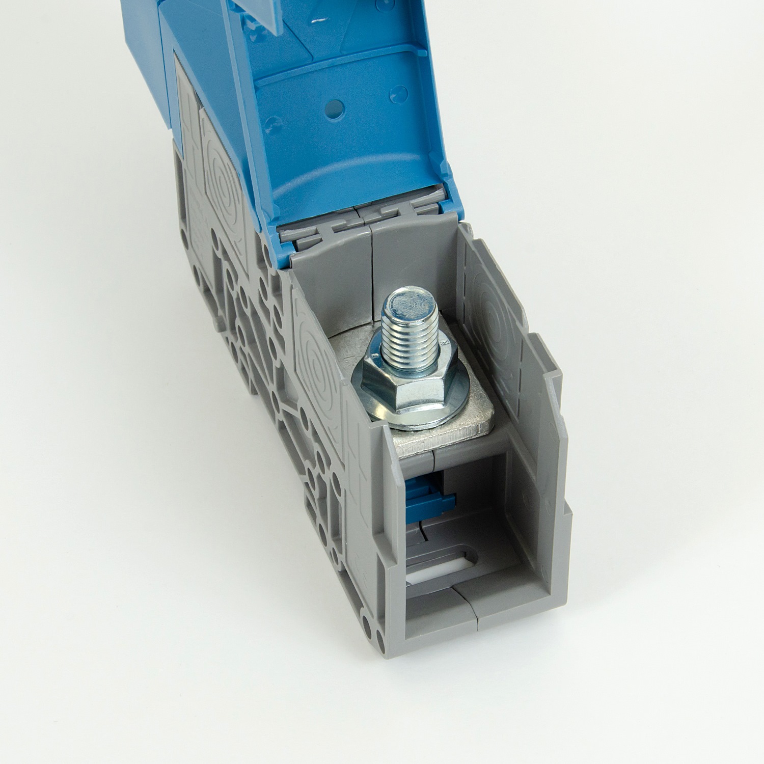 M12, 150mm2, threaded busbar rail connector / DIN rail terminal with protective cover, blue, ONKA, made in Turkey