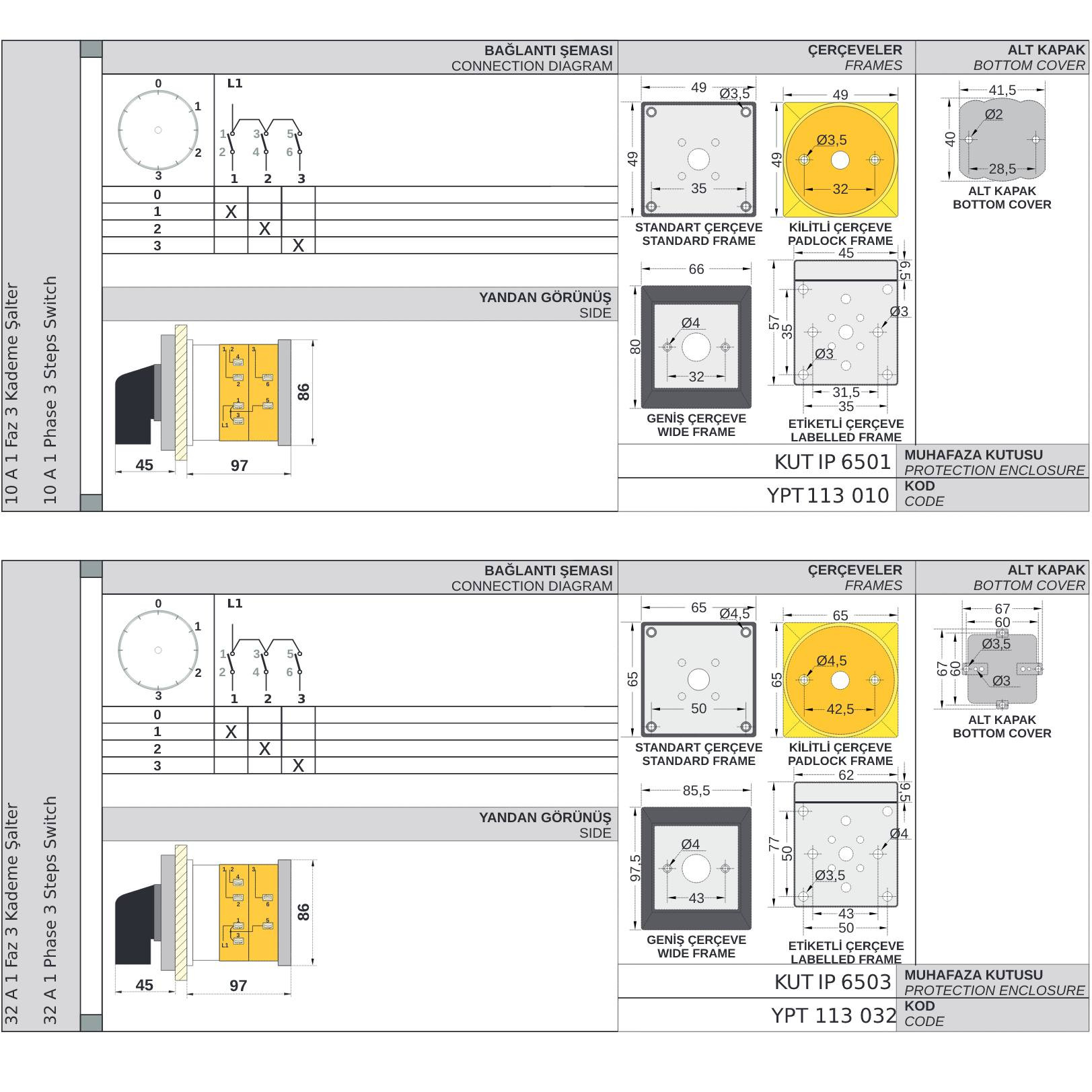 Step switch 0-1-2-3, rotary switch, 1-2 poles, 10-160A, YPT113 / YPT213, manufacturer OPAÅž (Turkey)